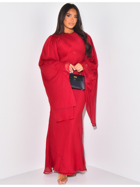 Langes Kleid aus gefüttertem Voile, das am Kragen und an den ausgestellten Ärmeln gekreuzt ist.