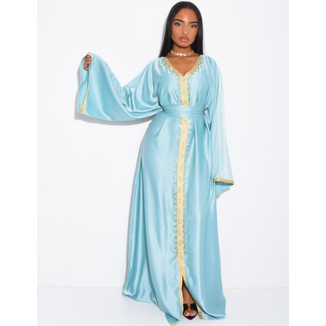Premium Abaya aus Satin mit handgenähten Kristallen und goldener Einfassung.