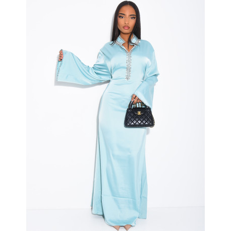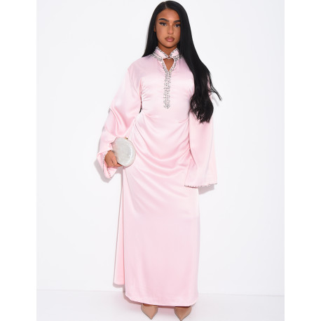 Hochwertige Satin-Abaya mit handgestickten Kristallen und Taillengürtel
