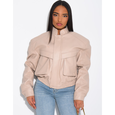 Kurze Bomberjacke aus genarbtem Kunstleder mit Schulterpolstern