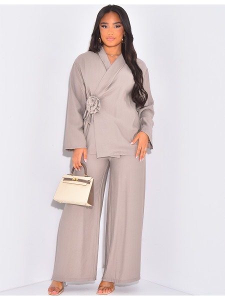 Set in Leinenoptik Wickeljacke mit Blumenmuster in Reliefoptik an der Taille.