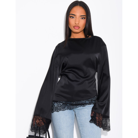 Satiniertes Oberteil mit langen Ärmeln, im Rücken gebunden und Spitzenbesatz