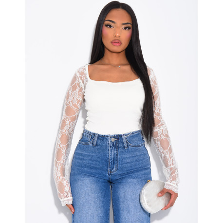 Top mit quadratischem Ausschnitt und Spitzenärmeln