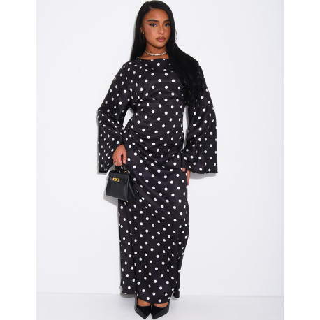 Langes Satin-Kleid mit Punkten, das am Rücken gebunden wird
