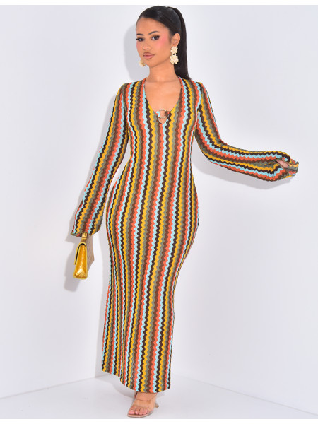 Langes Kleid aus mehrfarbigem Häkelgarn
