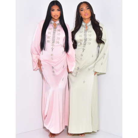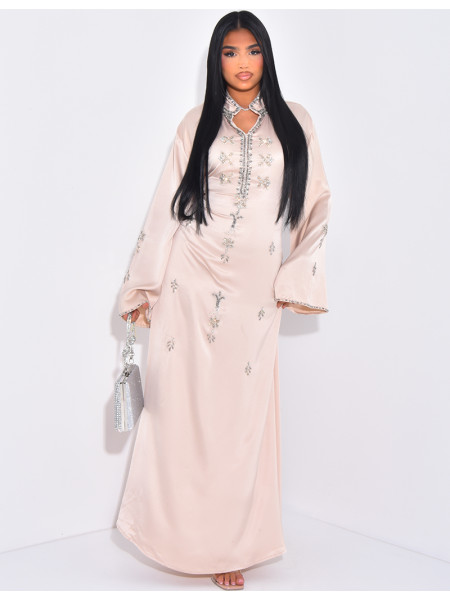 Handgefertigte Premium-Abaya aus Satin mit Perlenbesatz.