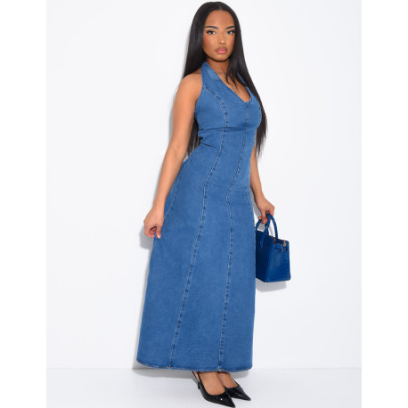 Langes, ausgestelltes Jeanskleid mit Rückenausschnitt zum Binden