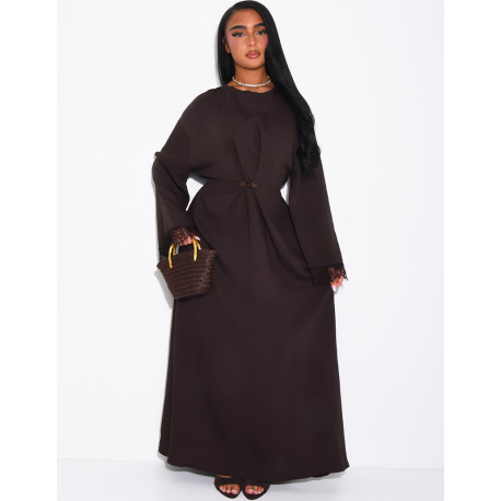 Langes Kleid in Leinenoptik, tailliert und mit Spitze an den Ärmeln