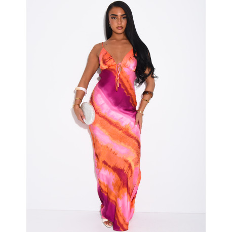 Langes, gebundeneres Kleid aus bedrucktem Satin