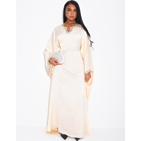 Abaya papillon en satin premium ornée de cristaux au col et sur les manches