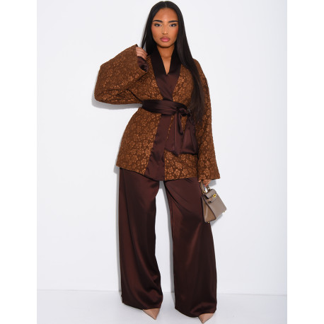 Ensemble kimono brocard ceinturé et pantalon en satin assorti