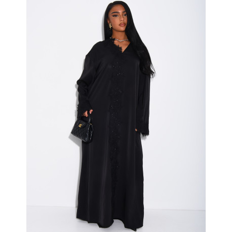 Abaya ample en satin fluide à empiècements en dentelle à strass