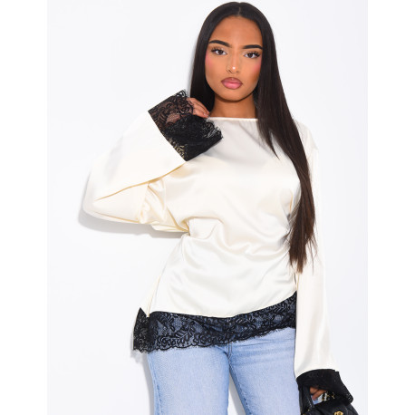 Top satiné manches longues noué dans le dos à bords en dentelle