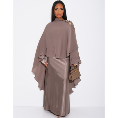 Ensemble robe manches longues en satin et cape plissée avec broche