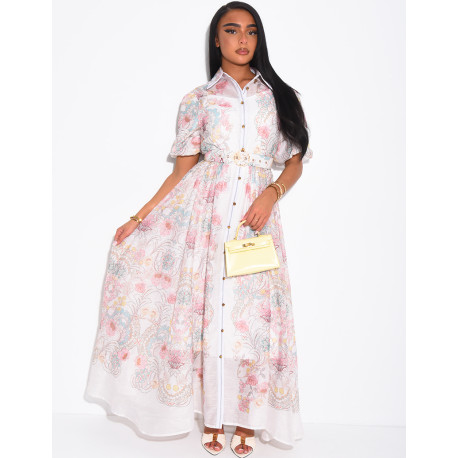 Robe longue en voile à motifs imprimés et ceinture assortie