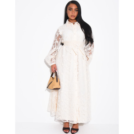 Robe longue brodée à manches bouffantes et ceinture assortie