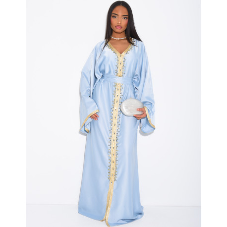 Premium satin abaya with hand-sewn crystals and gold trim