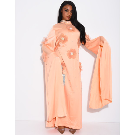 Satin abaya with embossed flowers and rhinestones