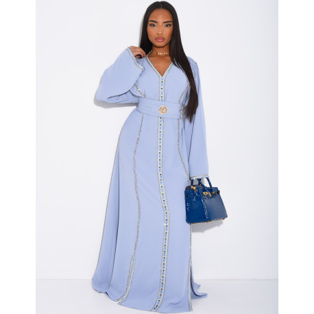 Satin abaya embellished with crystals and belt + brooch at the waist