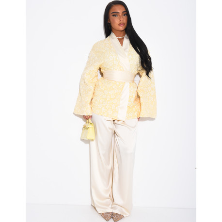 Ensemble kimono brocard ceinturé et pantalon en satin assorti