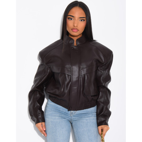 Short grained faux leather bomber jacket with shoulder pads
