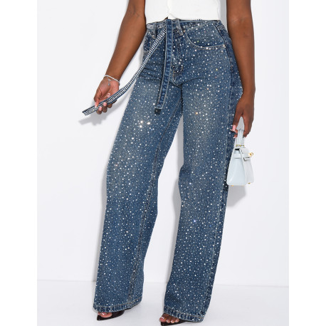 Wide-leg jeans covered in rhinestones with a matching belt