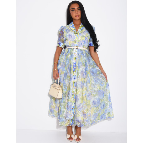 Floral-print voile button-down dress with a belt