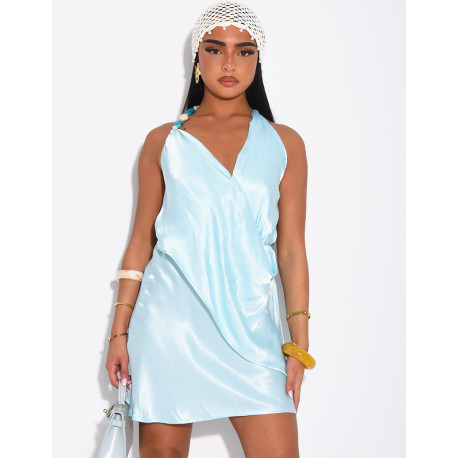 Short backless dress in satin with colorful beads