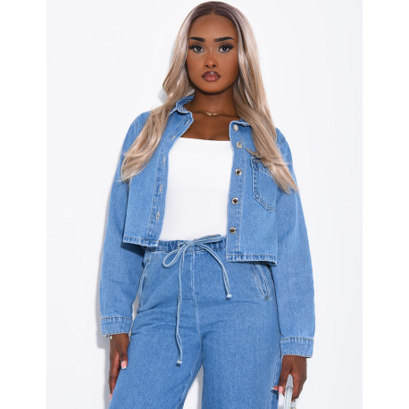 Short denim jacket with slit pockets
